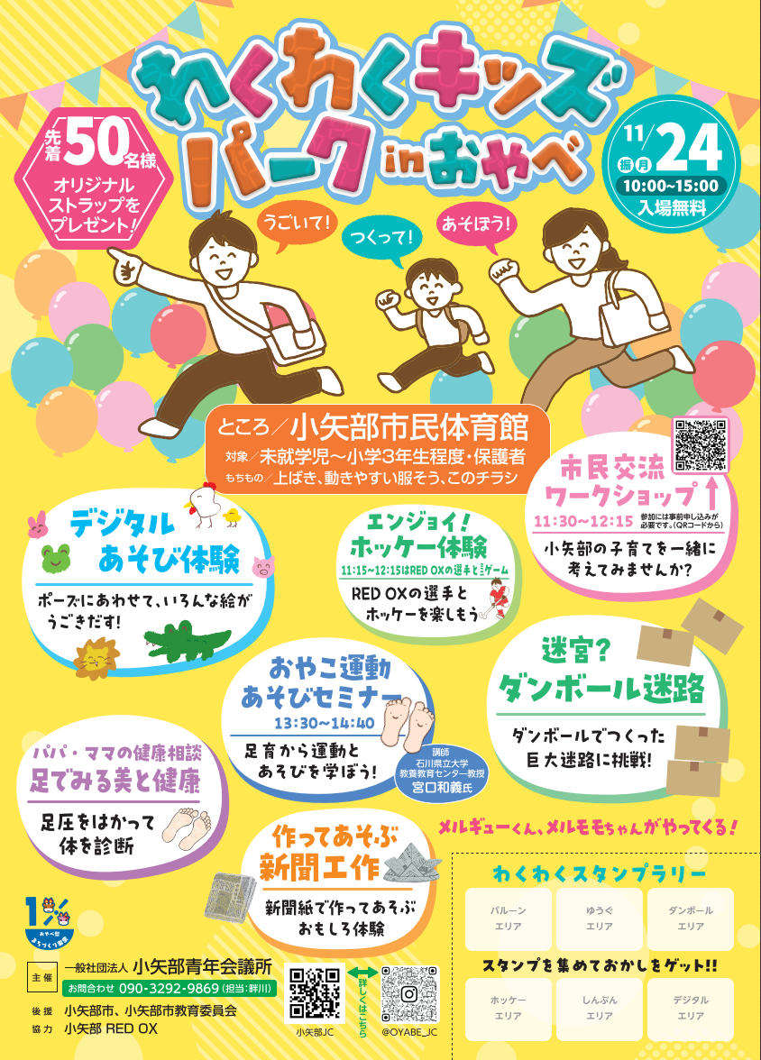 11月24日(振・月)に小矢部市民体育館にて、工作体験やエンジョイホッケー、ワークショップやセミナーを通して親子で運動・遊びの楽しさを体験できる屋内パーク「わくわくキッズパークinおやべ」を開催します!