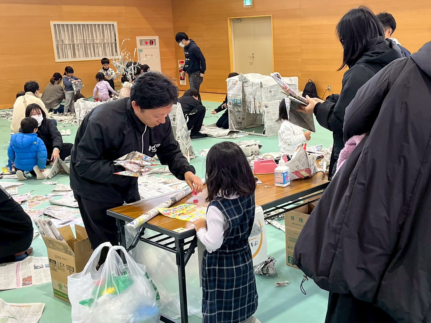 会場に入ってまず目を引いたのは、約150個もの段ボールを使って作られた「巨大段ボール迷路」です。子どもたちは迷路の中を夢中で駆け回り、ゴールした時の達成感に満ちた表情がとても印象的でした。
